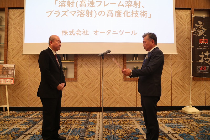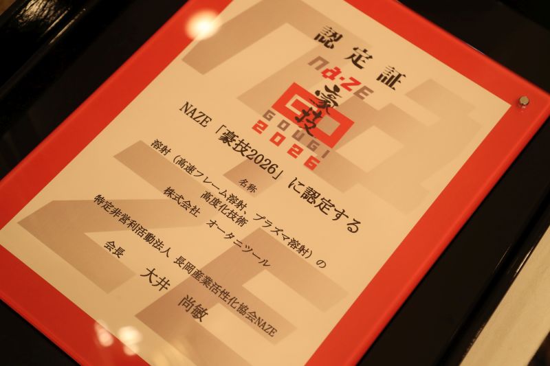 3月6日、ホテルニューオータニで『豪技2026』の認定証授与式がありました。NAZEでは長岡地域のモノづくり技術のブランド力の向上や地域産業の活性化を図ることを目的に、モノづくり企業の優れた技術や製品として「豪技」として認定する事業を行っています。この度見事㈱オータニツールの「溶射(高速フレーム溶射、プラズマ溶射)の高度化技術」が『豪技2026』に認定されました。